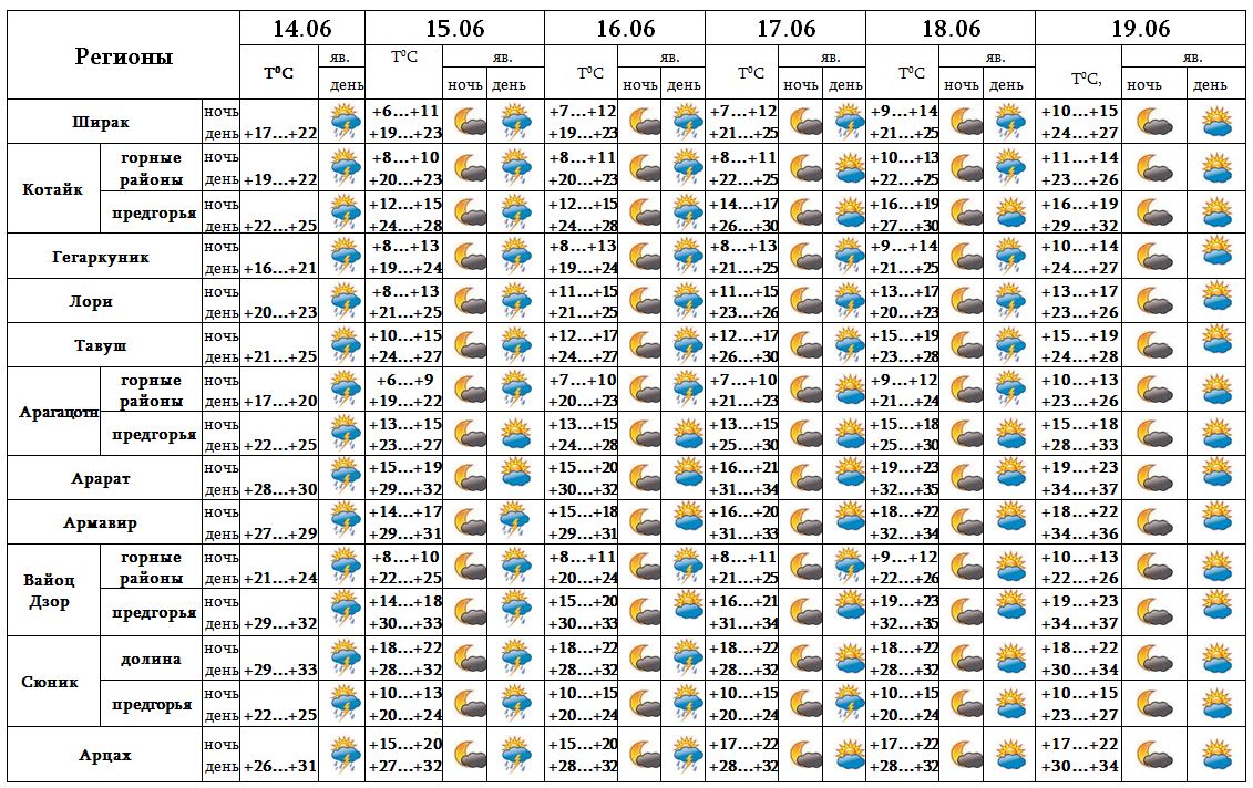 После полудня 14-го, с 15-16 июня в большинстве регионов, ночью и после полудня с 17-18 в отдельных регионах ожидается кратковременный дождь с грозой. В отдельных местах также ожидается град. 19-го июня ожидается погода без осадков.
