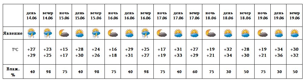 После полудня 14-го ожидается, ночью и вечером с 15-16 июня в отдельных местах города возможен кратковременный дождь с грозой, во время грозы также ожидается усиление ветра с порывами до 18-20 м/с. С 17-19 июня ожидается погода без осадков.