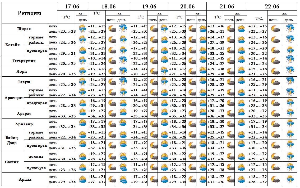После полудня 17-го июня, ночью и после полудня с 18-19 в отдельных регионах, 22-го в большинстве регионов ожидается дождь с грозой. В отдельных местах также ожидается град. С 20-21 июня ожидается погода без осадков.