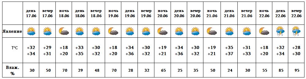 Вечером 17-го и 18-го июня в отдельных местах города возможен кратковременный дождь с грозой. С 19-21 июня ожидается погода без осадков. Днем и вечером 22-го июня ожидается дождь с грозой, во время грозы ожидается усиление ветра с порывами до 17-20 м/с.