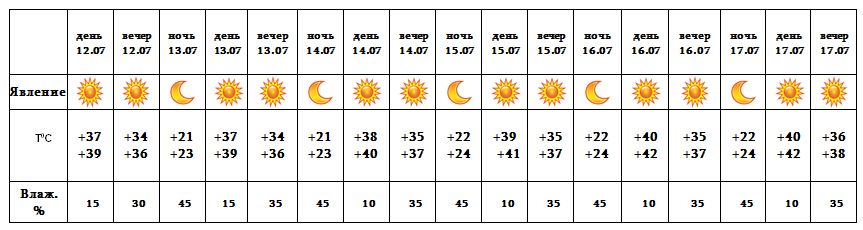 Днем 12-го, с 13-17 июля ожидается погода без осадков. В вечерние часы ожидается усиление ветра с порывами до 17-20 м/с.