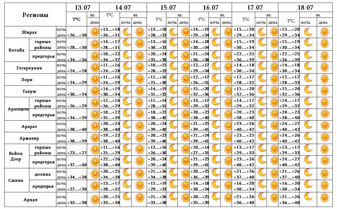 Территория республики продолжает находиться под влиянием тропических воздушных потоков из районов Аравийского полуострова, в связи с чем в дневные часы с 13-18 июля в Араратской долине, в предгорьях Арагацотна, Вайоц Дзора и в Ереване температура воздуха достигнет +39...+42 градуса.