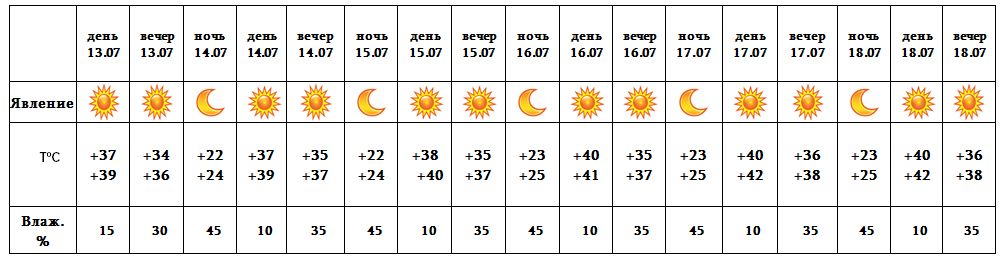 Днем 13-го, с 14-18 июля ожидается погода без осадков. В вечерние часы ожидается усиление ветра с порывами до 17-20 м/с.