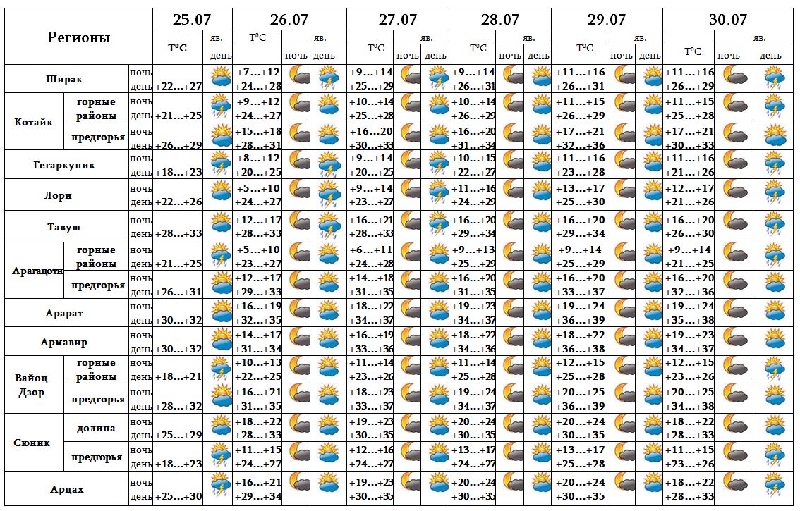 После полудня с 25-27 и 30-го июля в отдельных регионах ожидается кратковременный дождь с грозой. С 28-29 июля ожидается погода без осадков.