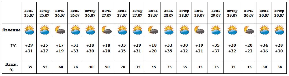 Днем 25-го, с 26-30 июля ожидается погода без осадков. В вечерние часы ожидается усиление ветра с порывами до 17-20 м/с.