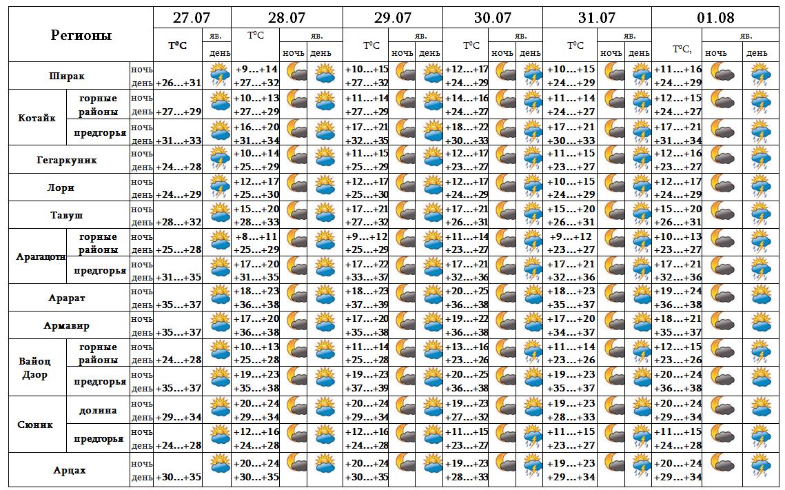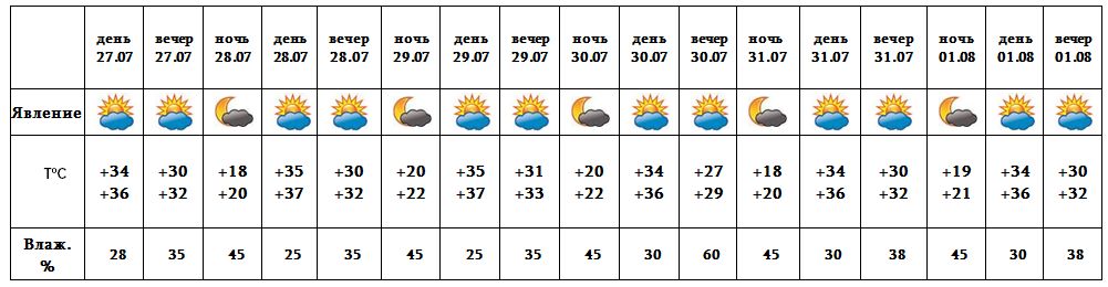 Днем 27-го, с 28-31 июля, 1-го августа ожидается погода без осадков. В вечерние часы ожидается усиление ветра с порывами до 15-20 м/с.