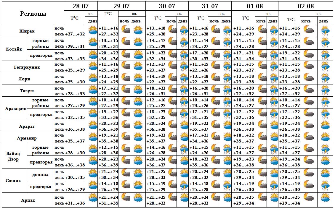 Днем 28-го, 29-го июля ожидается погода без осадков. После полудня с 30-31 июля, с 1-2 августа в отдельных регионах ожидается кратковременный дождь с грозой.