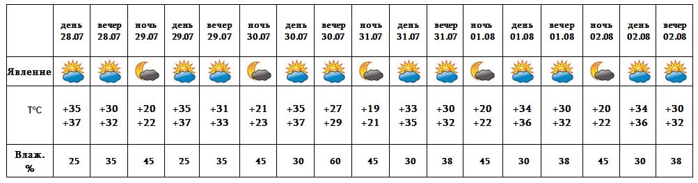 Днем 28-го, с 29-31 июля, с 1-2 августа ожидается погода без осадков. В вечерние часы ожидается усиление ветра с порывами до 15-20 м/с.