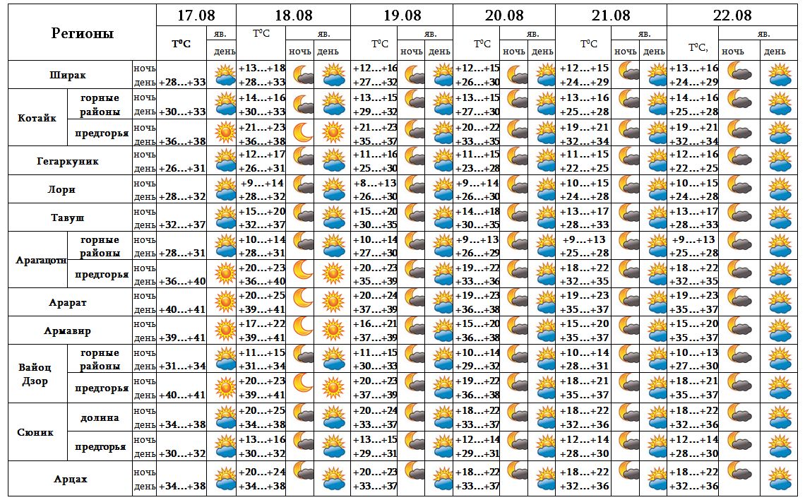 Территория республики продолжает находиться под воздействием тропических теплых воздушных потоков из регионов Ирака, в связи с чем с 17-18 августа в Араратской долине, предгорьях Арагацотна, Вайоц Дзора, долинах Сюника и городе Ереван температура воздуха днем достигнет +39…+41 градуса.