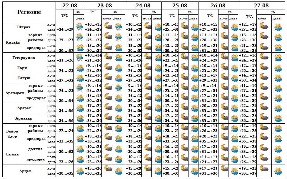 Ветер северо-восточный с порывами до 2-5 м/с. С 22-25 августа в предгорьях Арагацотна и Котайка, в регионе Армавир в вечерние часы ожидается усиление ветра с порывами до 14-17 м/с.