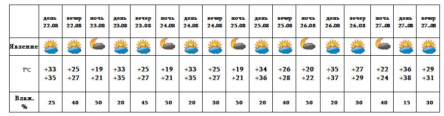 Днем 22-го, с 23-27 августа ожидается погода без осадков. В вечерние часы с 24-27 августа ожидается усиление ветра с порывами до 13-15 м/с.