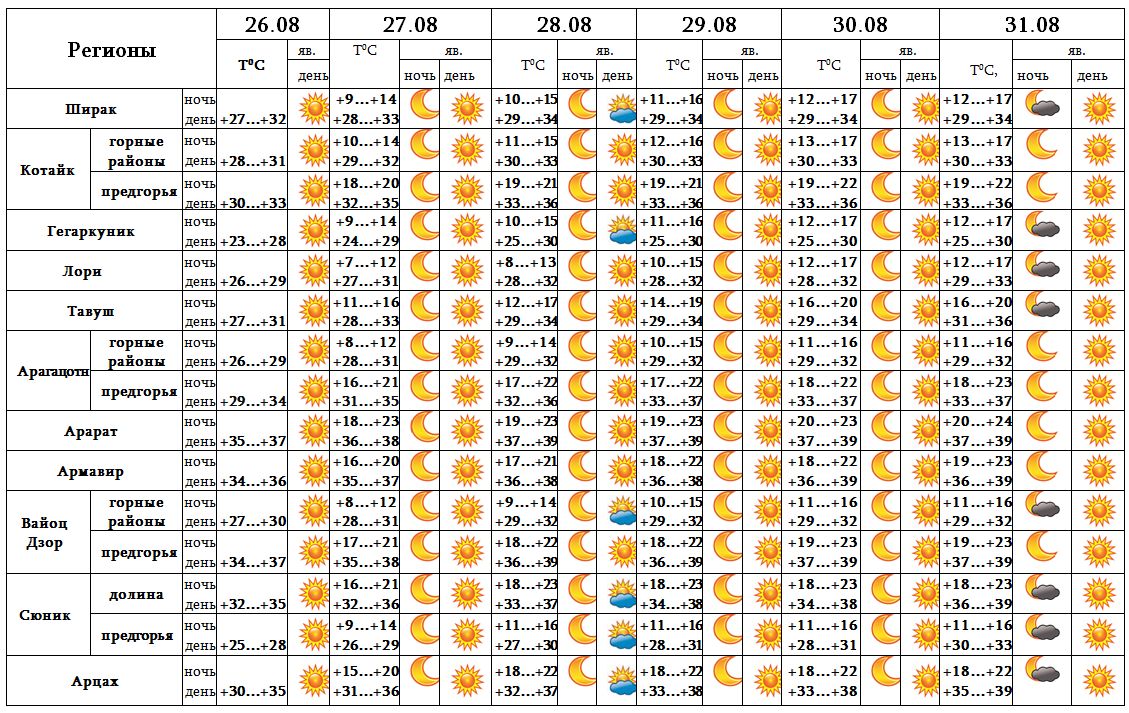 В Араратской долине, предгорьях Арагацотна, Котайка и Вайоц Дзора интенсивность ультрафиолетового излучения ожидается выше нормы. Рекомендуется избегать прямых солнечных лучей с 11:00 до 17:00 часов.