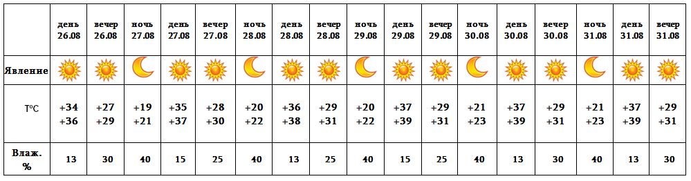 Днем 26-го, с 27-31 августа ожидается погода без осадков.