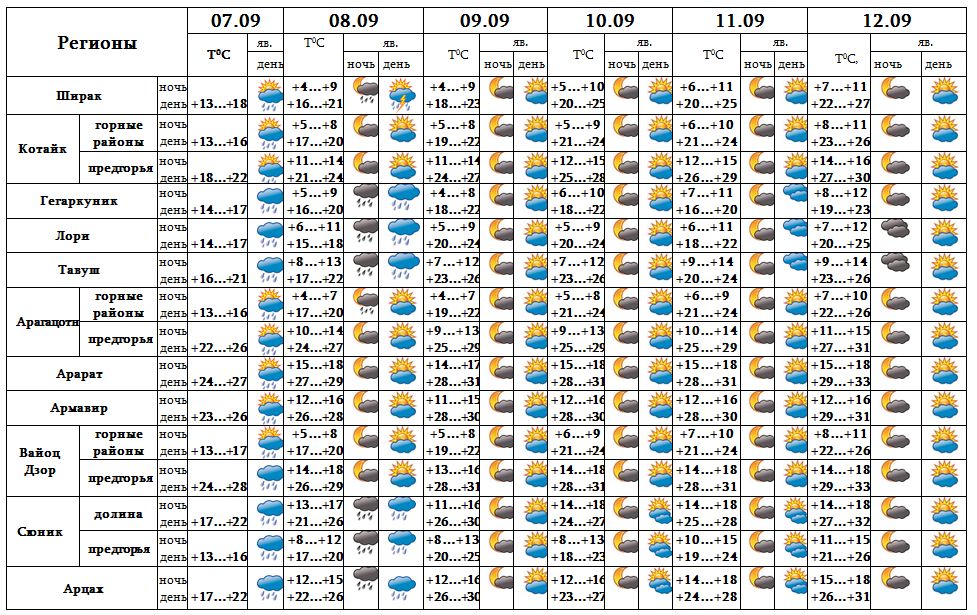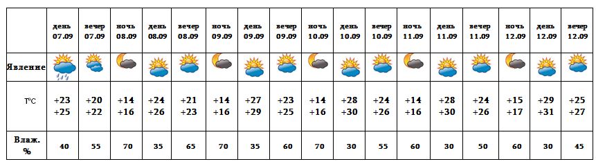 Днем 7-го сентября города в отдельных местах города возможен дождь с грозой. С 8-12 сентября ожидается погода без осадков, во время грозы ожидается усиление ветра с порывами до 15-19 м/с.
