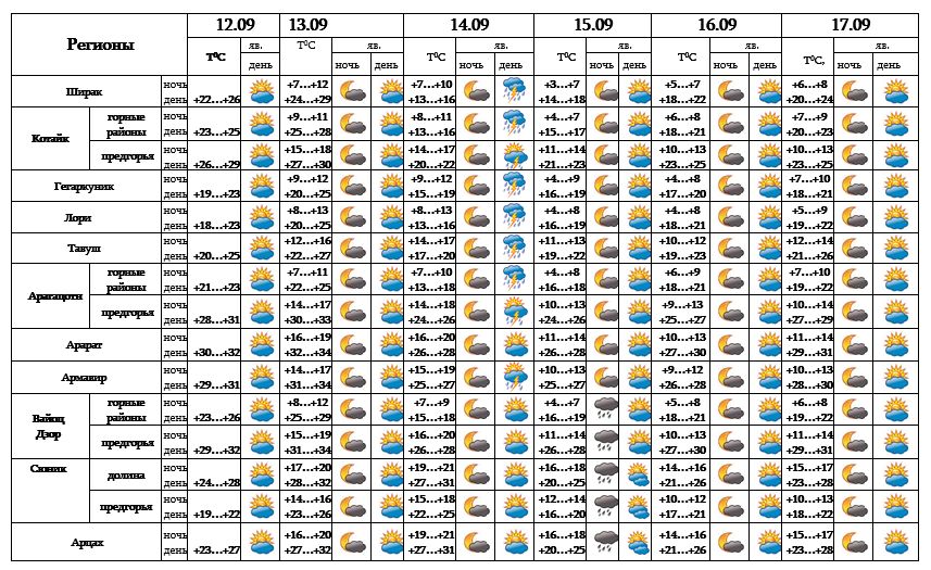 Днем 12-го, 13-го, ночью 14-го, днем 15-го, с 16-17 сентября ожидается погода без осадков. Днем 14-го, ночью 15-го сентября в отдельных регионах ожидается дождь, днем 14-го - также гроза.