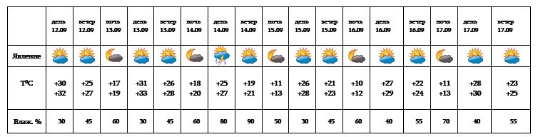 Днем 12-го, 13-го, с 15-17 сентября ожидается погода без осадков. После полудня 14-го сентября ожидается кратковременный дождь с грозой. Во время грозы ожидается усиление ветра с порывами до 15-19 м/с.