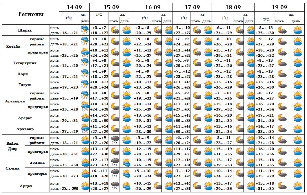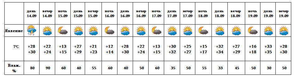 После полудня 14-го сентября в отдельных местах города возможен кратковременный дождь с грозой. С 15-19 сентября ожидается погода без осадков, во время грозы ожидается усиление ветра с порывами до 15-19 м/с.