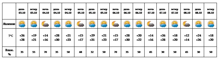 Днем 3-го и с 4-8 октября ожидается погода без осадков.