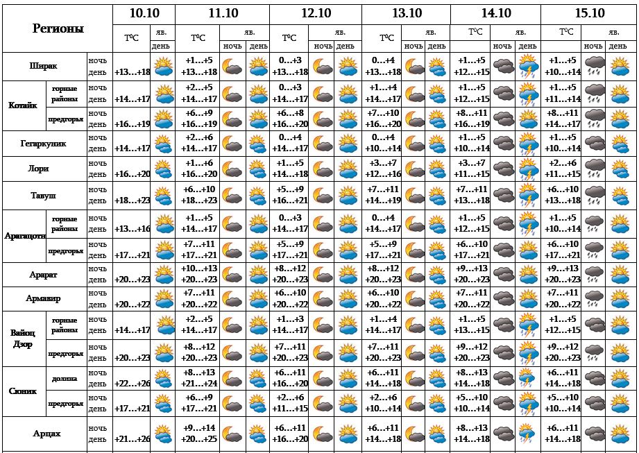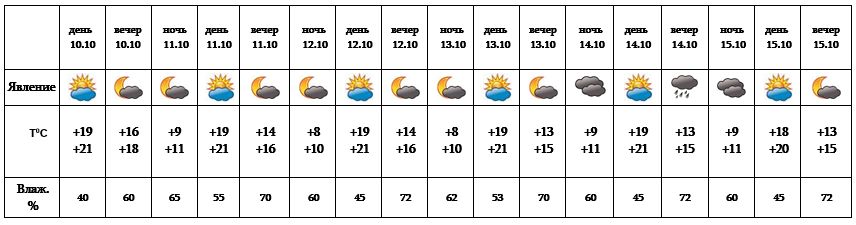 Днем 10-го, с 11-13, ночью 14-го, днем 15-го октября ожидается погода без осадков. Днем 14-го, ночью 15-го октября в отдельных регионах ожидается дождь с грозой.