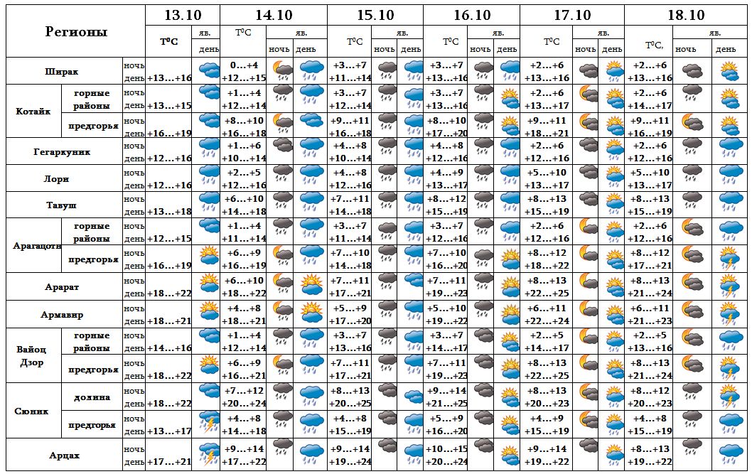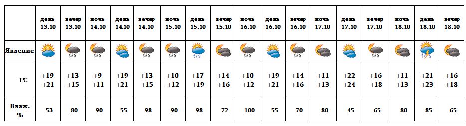 Днем 13-го, с 14-18 октября в отдельных регионах ожидается дождь, днем 13-го и 18-го также возможна гроза.
