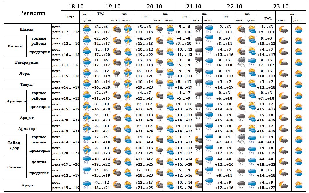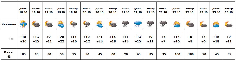 Днем 18-го, ночью и вечером 19-го и 20-го, 22-го октября в отдельных регионах, 21-го в большинстве регионов ожидается дождь, с 18-20 в отдельных местах также возможна гроза. 23-го октября ожидается погода без осадков.