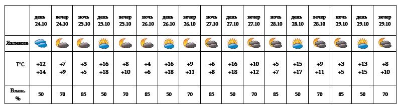 Днем 24-го октября в отдельных регионах ожидается дождь, с 25-29 ожидается погода без осадков.