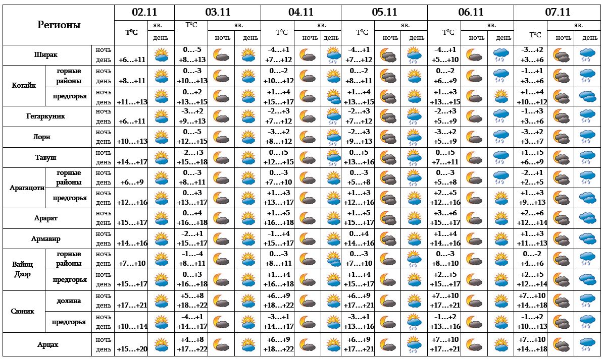 В ночь с 2-го на 3-е ноября в Араратской долине и ее предгорьях температура воздуха достигнет до -2 градусов.