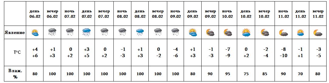 Вечером 6-го, 7-го февраля ожидается мокрый снег. 8-го, ночью 9-го февраля ожидаются снег и туман. Днем 9-го, с 10-11 февраля ожидается погода без осадков. 6-го февраля ожидается усиление ветра с порывами до 12-15 м/с.