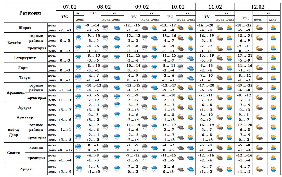 Днем 7-го, ночью 8-го февраля в большинстве регионов, днем 8-го, 9-го, ночью 10-го в отдельных регионах ожидаются снег и туман, в горных районах - метель, низкая горизонтальная видимость. Днем 7-го февраля в долинах республики ожидаются осадки в виде мокрого снега.