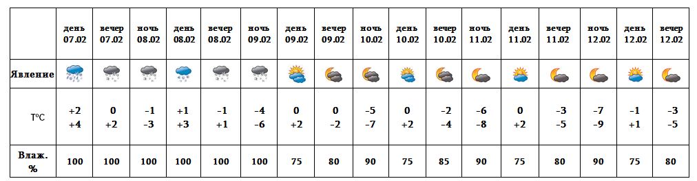 Днем 7-го февраля ожидается мокрый снег, вечером - снег. 8-го, ночью 9-го февраля ожидаются снег и туман. Днем 9-го, с 10-12 февраля ожидается погода без осадков.