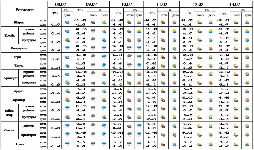 Днем 8-го, 9-го, 10-го февраля в отдельных регионах ожидается снег и туман, в горных районах - метель, низкая горизонтальная видимость. С 11-13 февраля ожидается погода без осадков.