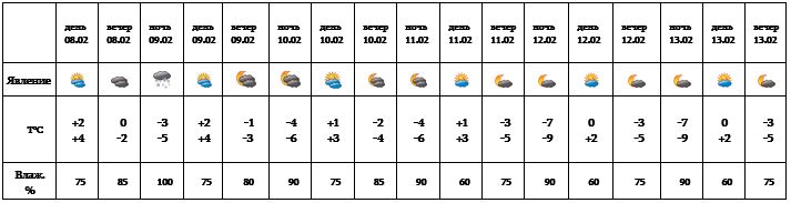 Днем 8-го, с 10-13 февраля ожидается погода без осадков. Ночью 9-го февраля возможен слабый снег.