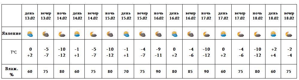 Днем 13-го, 14-го, с 17-18 февраля ожидается погода без осадков. С 15-16 февраля в отдельных местах города возможен небольшой снег. 16-го февраля также ожидается усиление ветра с порывами до 13-16 м/с.
