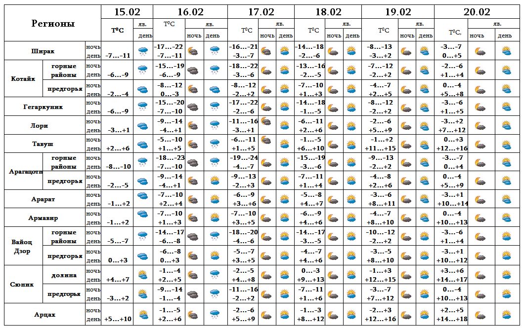 Днем 15-го, ночью 16-го февраля в отдельных регионах ожидается небольшой снег, в горных местах - метель. С 17-20 февраля ожидается погода без осадков.