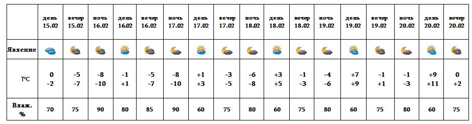 Днем 15-го, 16-го февраля в отдельных местах города возможен небольшой снег. 16-го февраля также ожидается усиление ветра с порывами до 10-12 м/с. С 17-20 февраля ожидается погода без осадков.