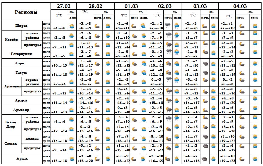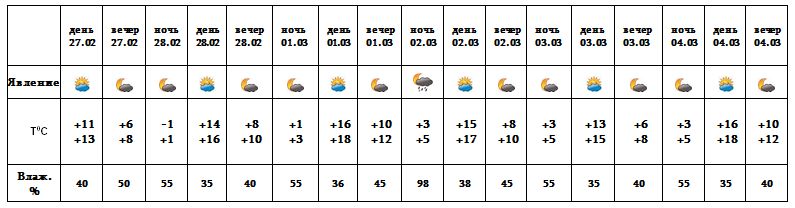 Днем 27-го, 28-го февраля, 1-го, днем 2-го, с 3-4 марта ожидается погода без осадков. Ночью 2-го марта ожидается кратковременный дождь.