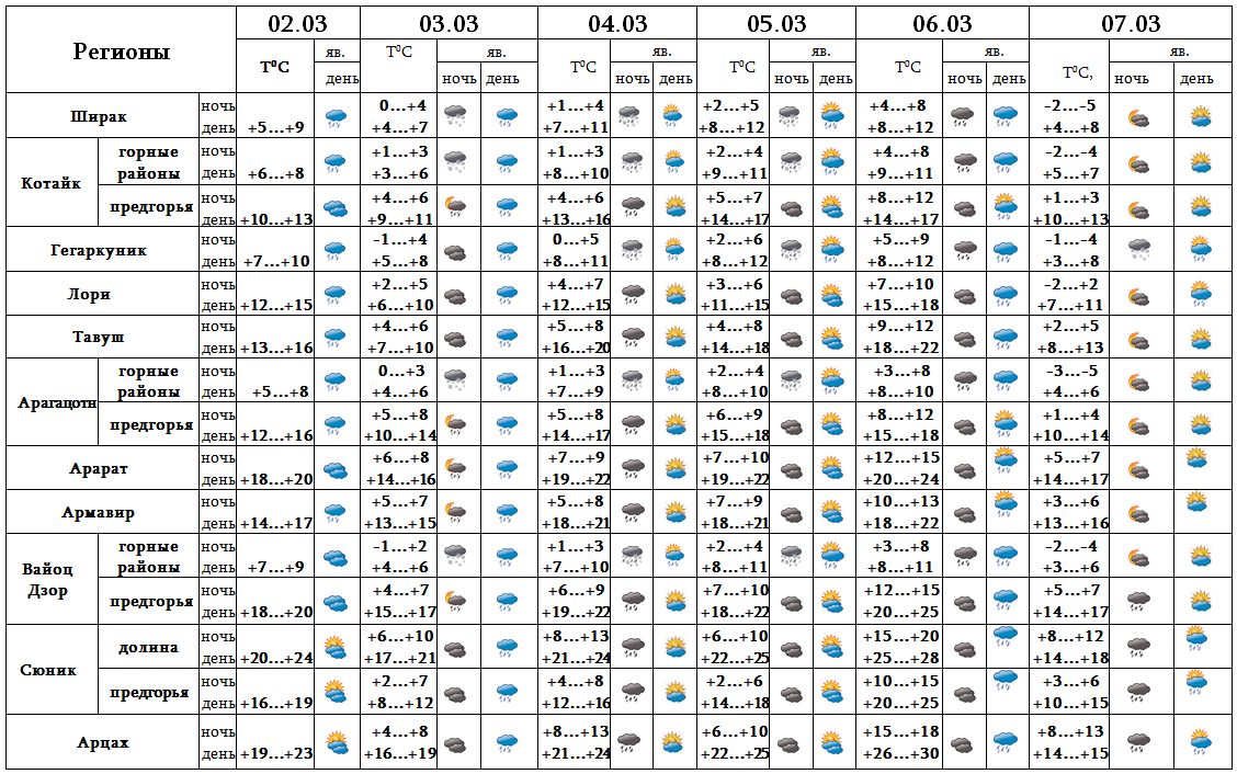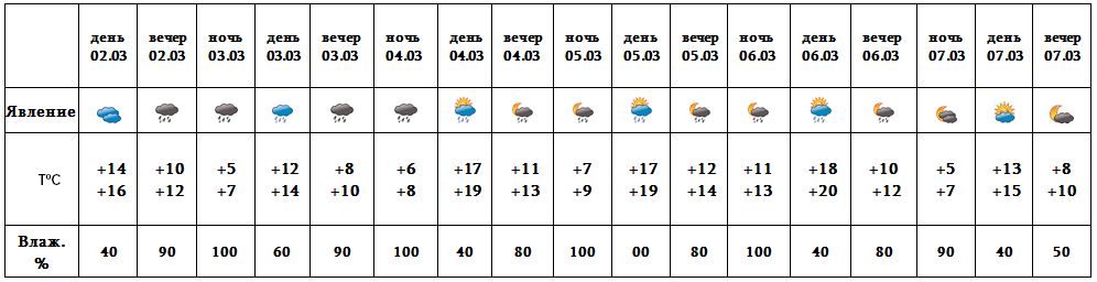 С 2-6 марта время от времени ожидается кратковременный дождь. 7-го марта ожидается погода без осадков.