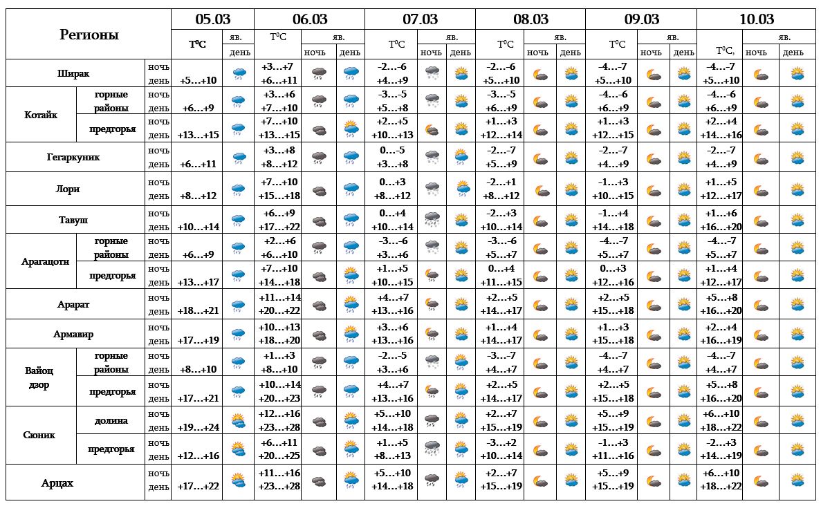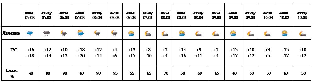 Днем 5-го марта, 6-го, ночью 7-го время от времени ожидается кратковременный дождь. Днем 7-го марта, с 8-10 ожидается погода без осадков. 6-го марта ожидается усиление ветра с порывами до 17-20 м/с.
