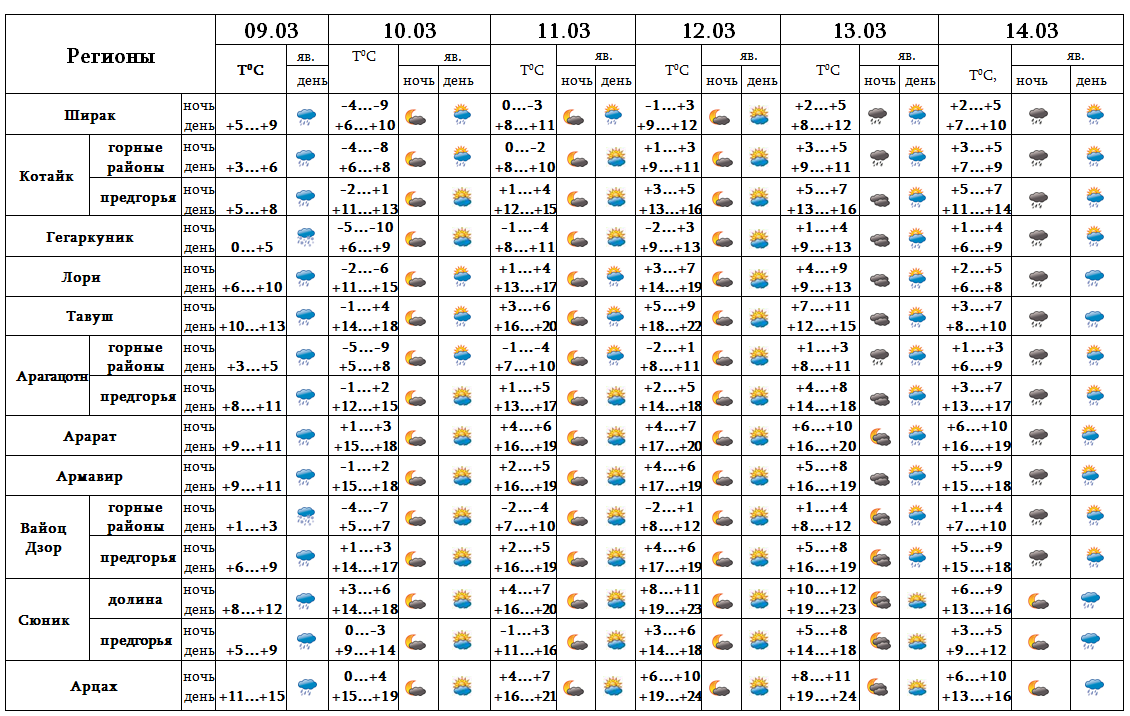 Днем 9-го, с 10-11, с 13-14 марта в отдельных регионах ожидаются осадки. 12-го марта ожидается погода без осадков.