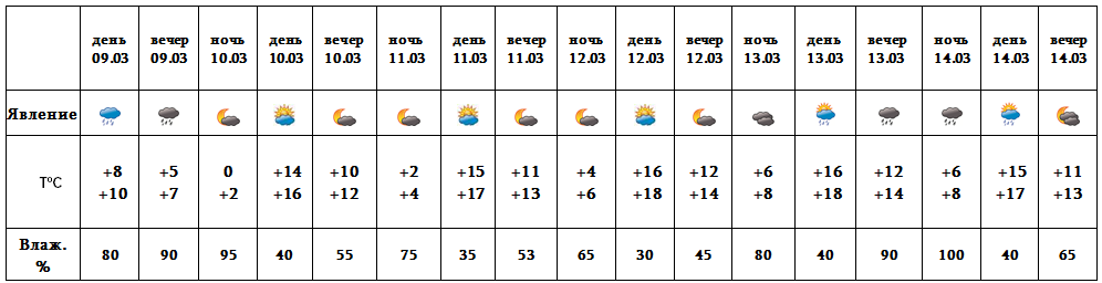 Днем и вечером 9-го, с 13-14 марта ожидается дождь. С 10-12 марта ожидается погода без осадков.