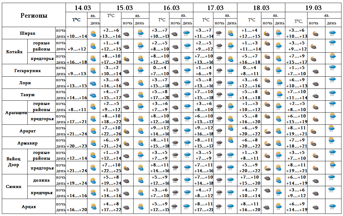 Днем 14-го, ночью 15-го, 18-го и 19-го марта ожидается погода без осадков. Днем 15-го и 18-го марта в отдельных регионах, с 16-17, днем 19-го в большинстве регионов ожидается дождь.