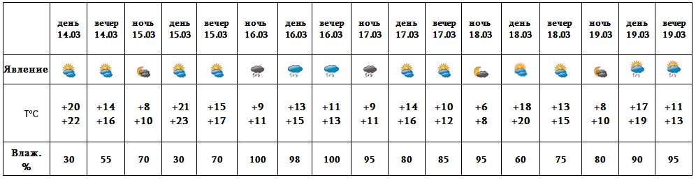 Днем 14-го, 15-го, 18-го, ночью 19-го марта ожидается погода без осадков. 16-го, ночью и утром 17-го, днем 19-го марта ожидается дождь.