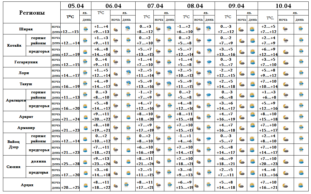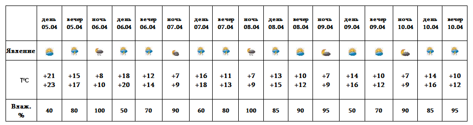 После полудня 5-го, с 6-8, 10-го апреля возможен кратковременный дождь с грозой. 9-го апреля ожидается погода без осадков.