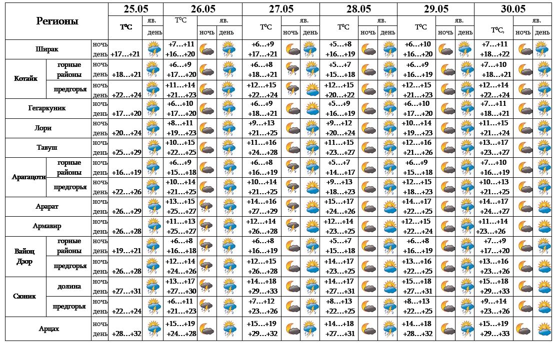 Днем 25-го, 26-го, 29-го мая в большинстве регионов, с 27-28, 30-го в отдельных регионах в основном после полудня ожидается кратковременный дождь с грозой. В отдельных местах также возможен град.