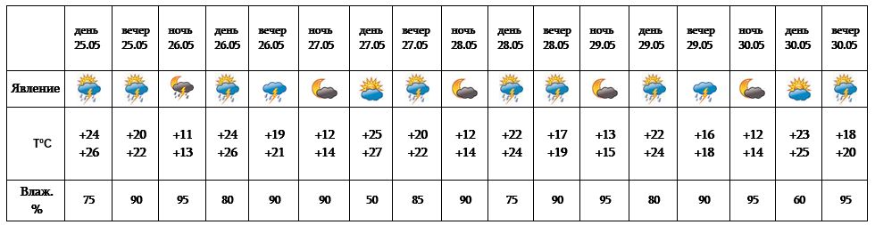 С 25-26, после полудня с 28-29 мая ожидается, 27-го, вечером 30-го возможен кратковременный дождь с грозой. Во время грозы - усиление ветра со скоростью 14-18 м/с.