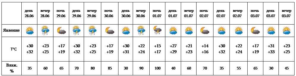 Днем 28-го, с 29-30 июня, днем 1-го июля в отдельных регионах, ночью 1-го июля в большинстве регионов ожидается кратковременный дождь с грозой. Вечером 30-го июня и ночью 1-го июля отдельных местах - интенсивно. С 28-30 июня, 1-го июля в отдельных местах также ожидается град. С 2-3 июля ожидается погода без осадков.