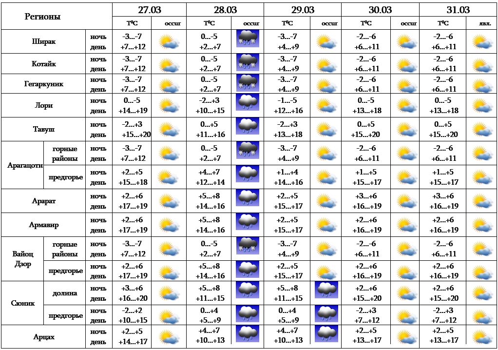27-го марта, ночью 28-го, с 30-31-го ожидается погода без осадков, во второй половине дня 28-го, ночью 29-го в большинстве регионов, днем 29-го в Сюнике и в Арцахе ожидаются осадки, в отдельных местах-усиление ветра до 15-20 м/с.