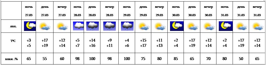 27-го марта, ночью 28-го, днем 29-го, с 30-31-го ожидается погода без осадков. Во второй половине дня 28-го, ночью 29-го ожидается дождь.