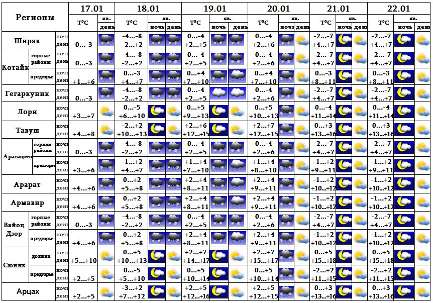 Днем 17-го, с 18-19, ночью 20-го января в отдельных местах время от времени ожидаются слабые осадки, в отдельных местах ожидается усиление ветра до 15-20 м/с. Днем 20-го, с 21-22 ожидается погода без осадков.