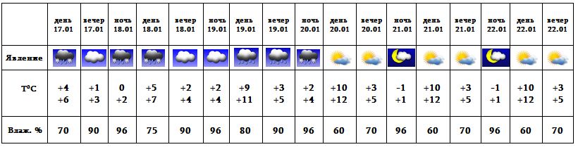 Днем 17-го, с 18-19, ночью 20-го января время от времени возможны слабые осадки, в ночное время суток - в виде мокрого снега. Днем 20-го, с 21-22 ожидается погода без осадков.